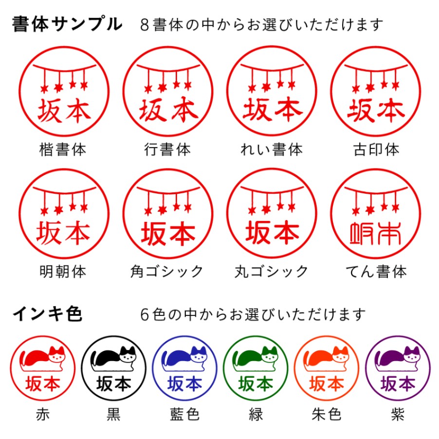 書体:楷書体・行書体・れい書体・古印体・明朝体・角ゴシック・丸ゴシック・てん書体