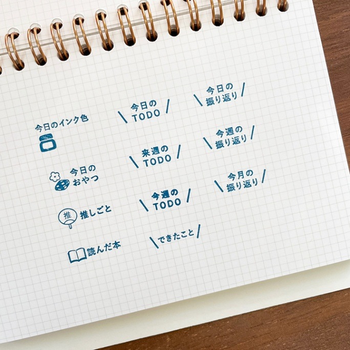 手帳やノートに押すことで簡単に日々の記録を記すことができます。