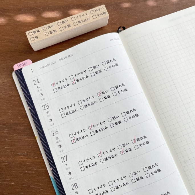 手帳やノートに押すことで簡単に日々の記録を記すことができます。