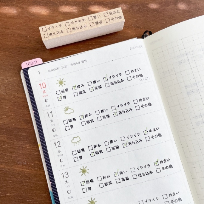 手帳やノートに押すことで簡単に日々の記録を記すことができます。