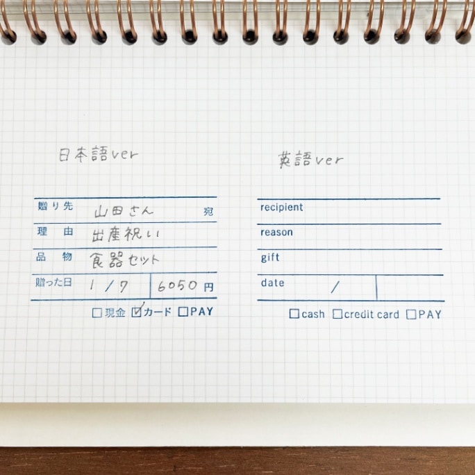 贈り先、理由、品物、日付、金額を記入できます。