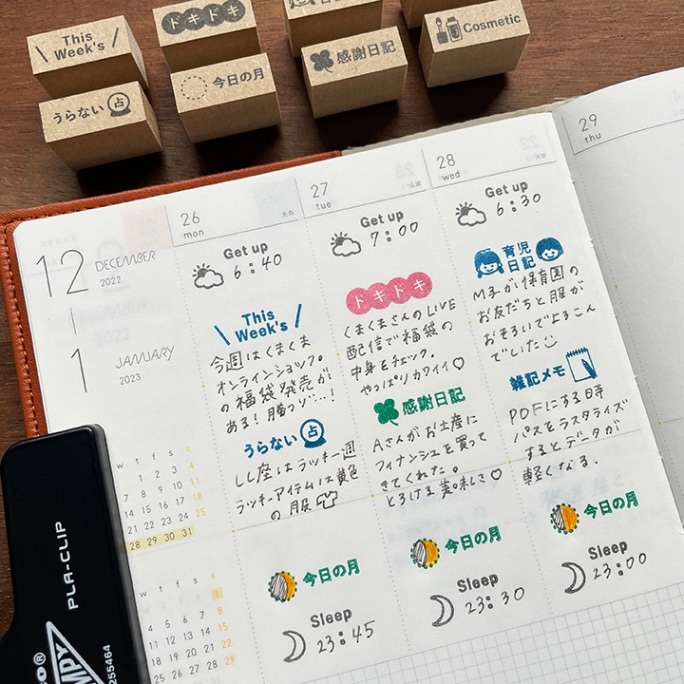 手帳やノートに押すことで簡単に日々の記録を記すことができます。